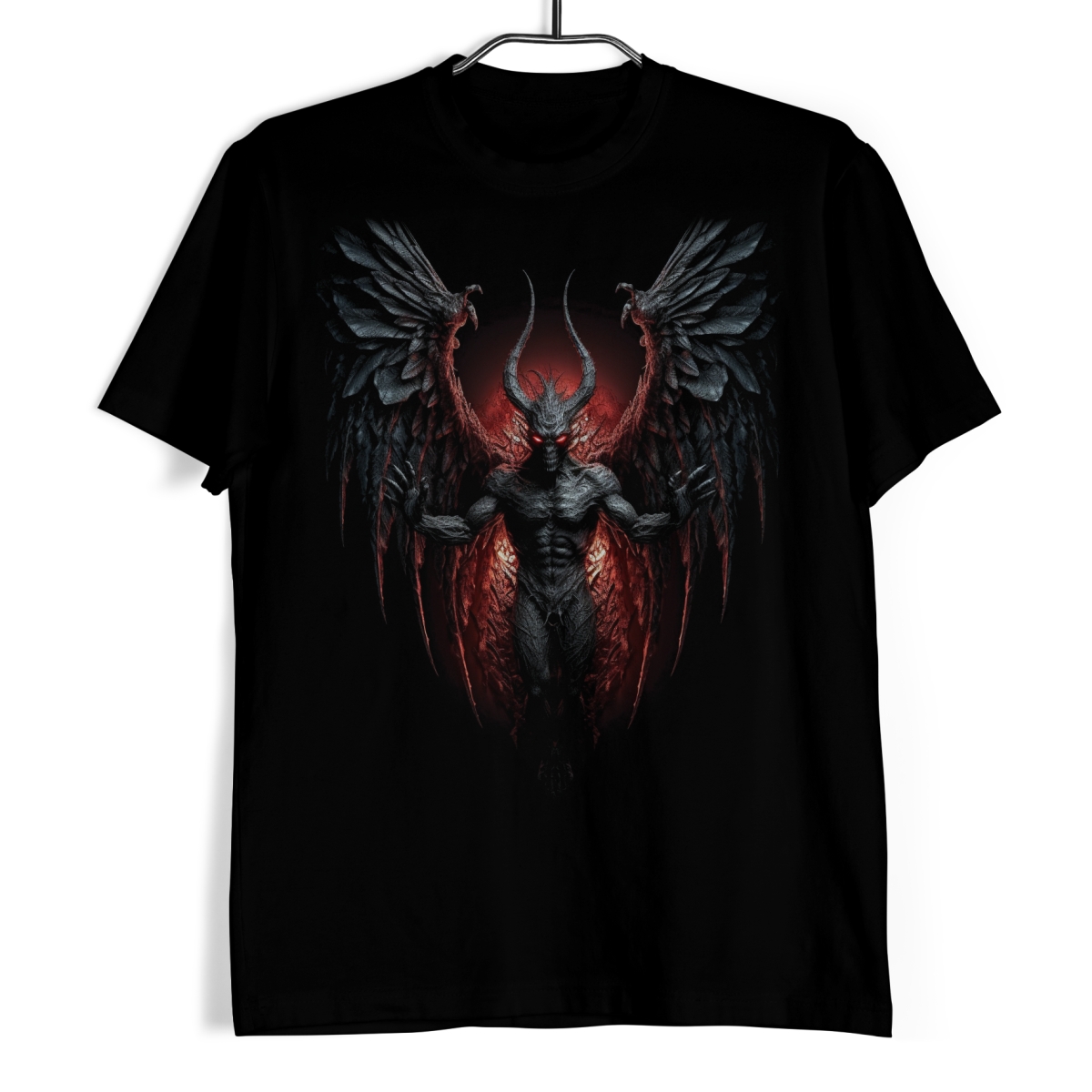Koszulka męska w kolorze czarnym ze wzorem przedstawiającym samego diabła, Lucyfera z piekielnymi skrzydłamina tle rozjuszonego ognia.