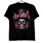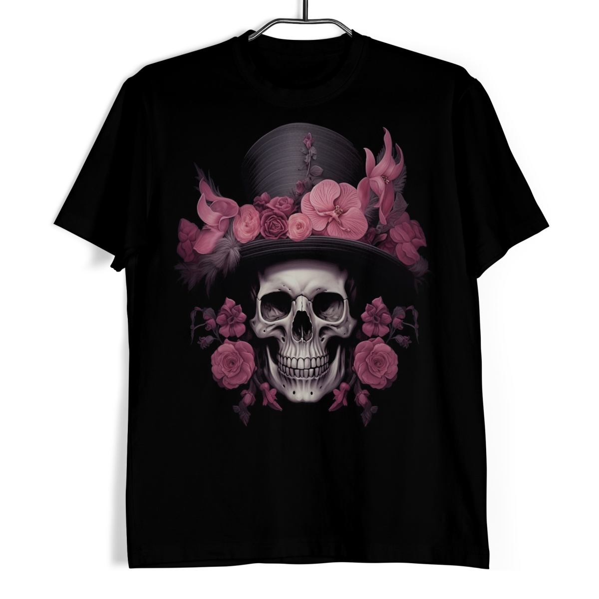 Koszulka męska w kolorze czarnym ze wzorem przedstawiającym czaszkę w kapeluszu śród kwiatów, wyjętą niemalże ze święta "De los Muertos".