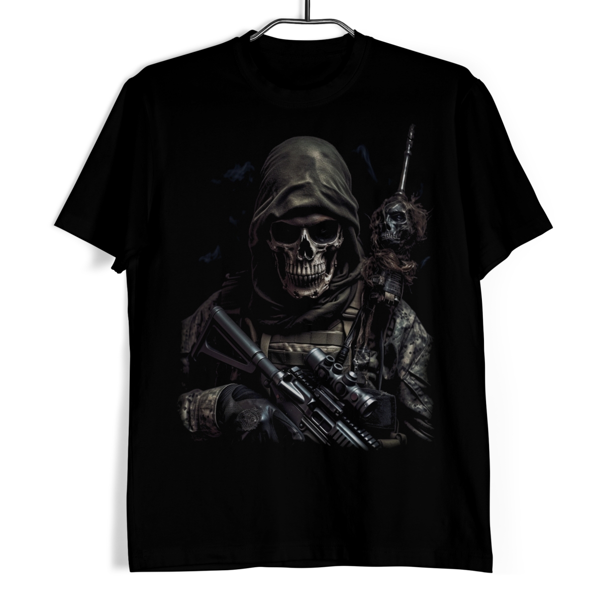 Koszulka męska w kolorze czarnym ze wzorem przedstawiającym ,artwego żołnierza z bronią palną ,zwiastującego śmierć.