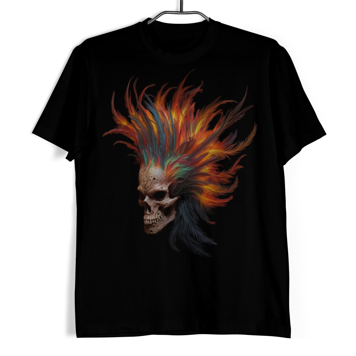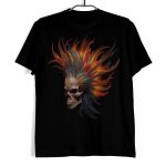 Koszulka męska w kolorze czarnym ze wzorem przedstawiającym czaszkę, której płonie punkowski irokez. Punk's not dead!