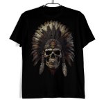 Koszulka męska w kolorze czarnym ze wzorem przedstawiającym czaszkę z pióropuszem. Idealna propozycja dla osób lubujących się w klimatach indiańskich z pazurem.