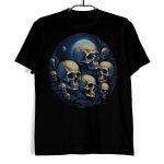 Koszulka męska w kolorze czarnym ze wzorem przedstawiającym kompozycję czaszek w niebieskiej przestrzeni. Całość układa się w kształt okręgu.