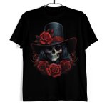 Koszulka męska w kolorze czarnym ze wzorem przedstawiającym czaszkę w stylu meksykańskiego święta Dia de Muertos wśród czerwonych róż.