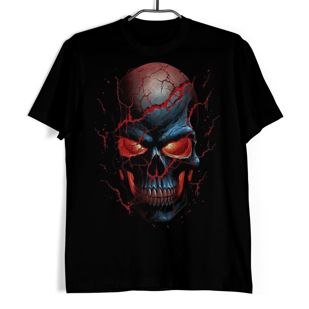Koszulka męska w kolorze czarnym ze wzorem przedstawiającym kruszącą się czaszkę z czerwonymi, ognistymi szczelinami.