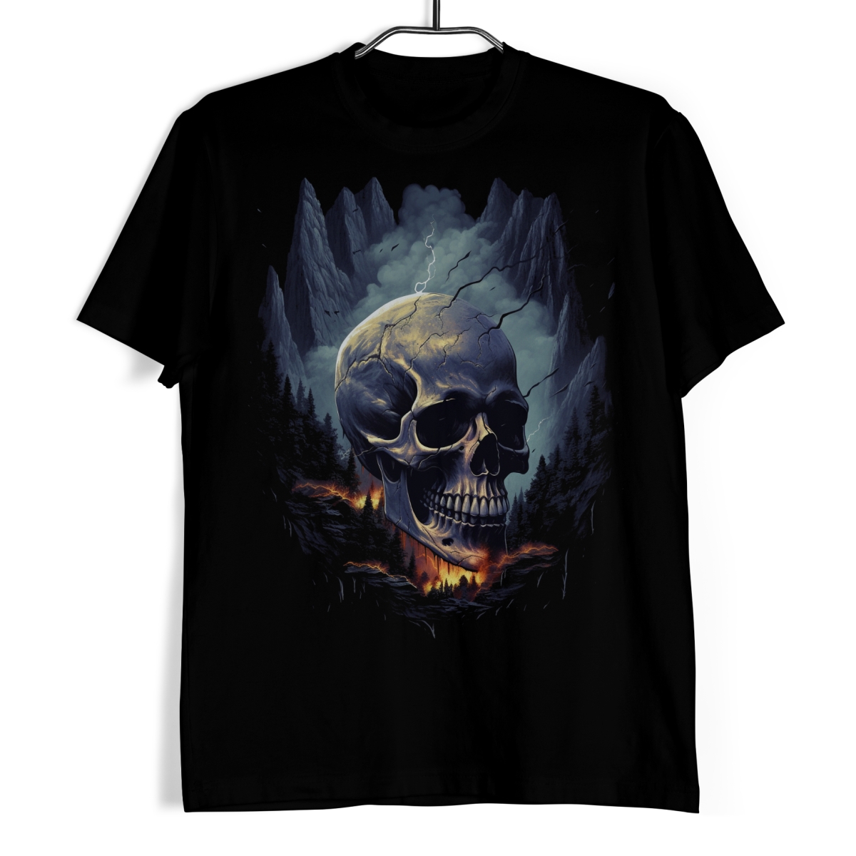 Koszulka męska w kolorze czarnym ze wzorem przedstawiającym czaszkę nad płonącą, piekielną otchłanią. W tle znajduje się las oraz dym z samego piekła.