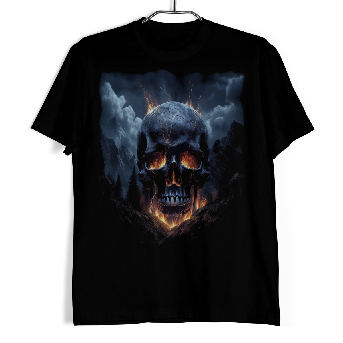 Koszulka męska w kolorze czarnym ze wzorem przedstawiającym płonącą górę w kształcie czaszki na tle mrocznych gór i lasów.