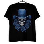 Koszulka męska w kolorze czarnym ze wzorem przedstawiającym czaszkę w stylu meksykańskiego święta Dia de Muertos wśród niebieskich róż.