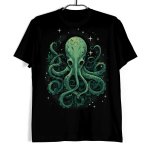 Koszulka męska w kolorze czarnym ze wzorem przedstawiającym zieloną ośmiornicę wśród gwiazd.