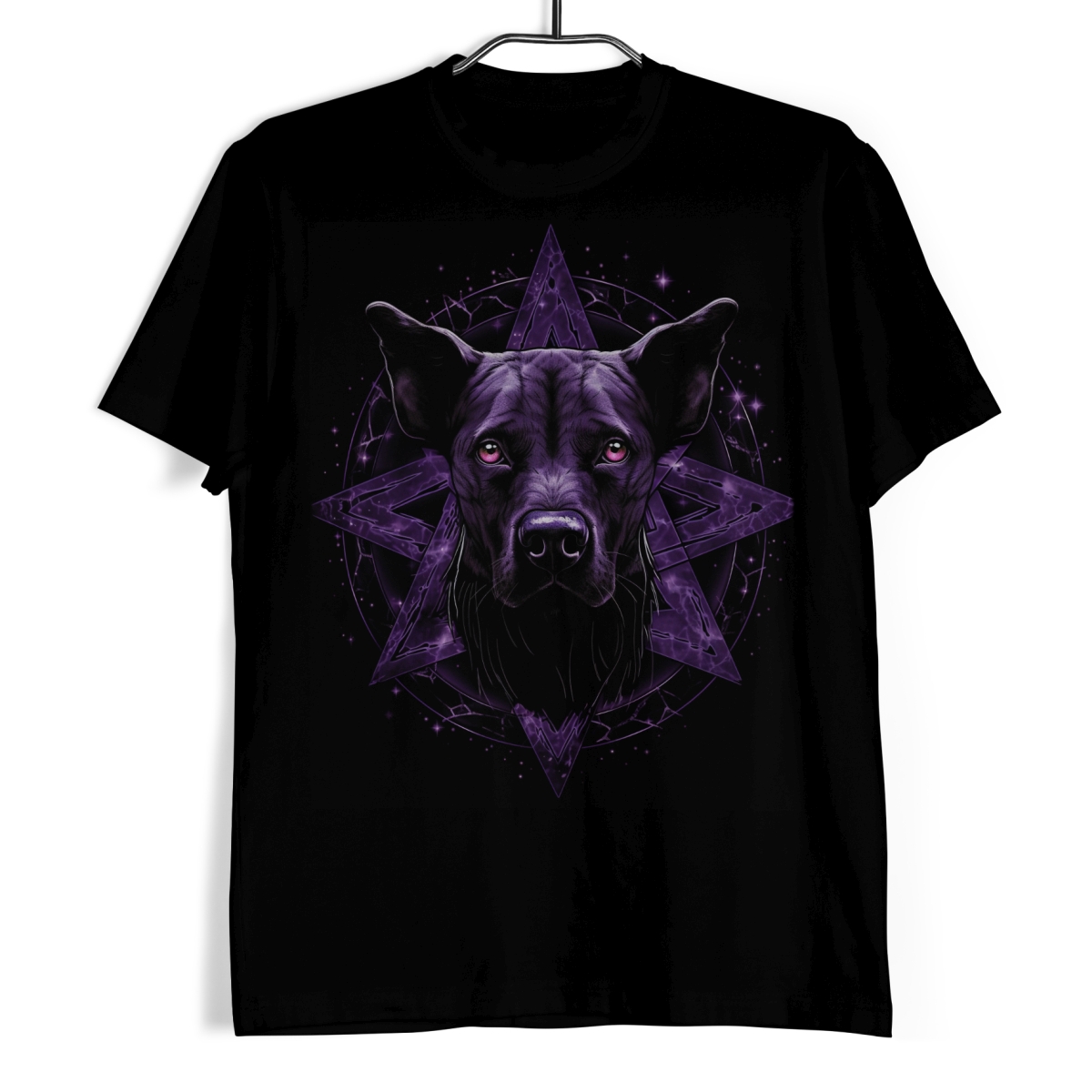 Koszulka męska w kolorze czarnym ze wzorem przedstawiającym psa na fioletowym tle.