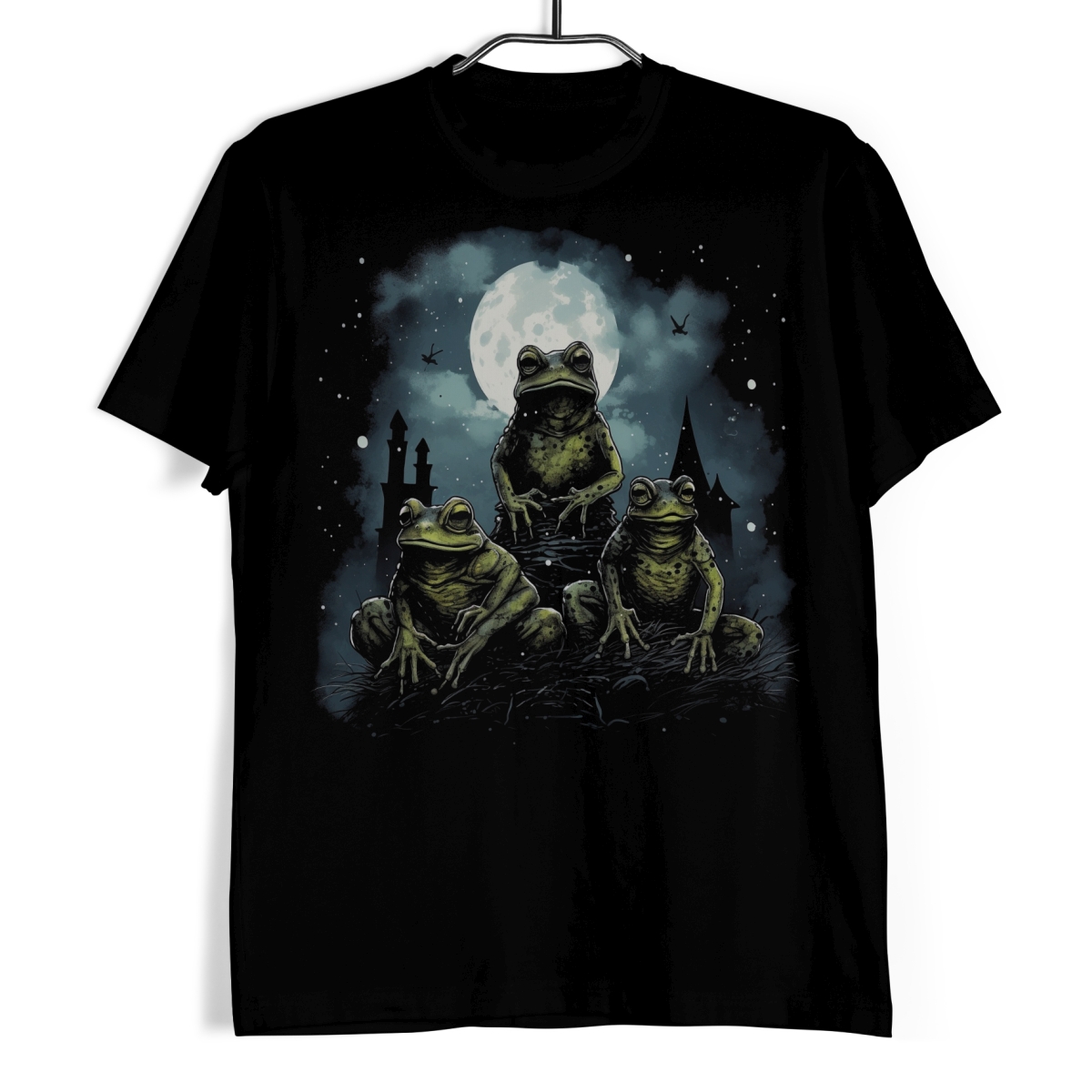 Koszulka męska w kolorze czarnym ze wzorem przedstawiającym żaby na tle księżyca oraz zamku.