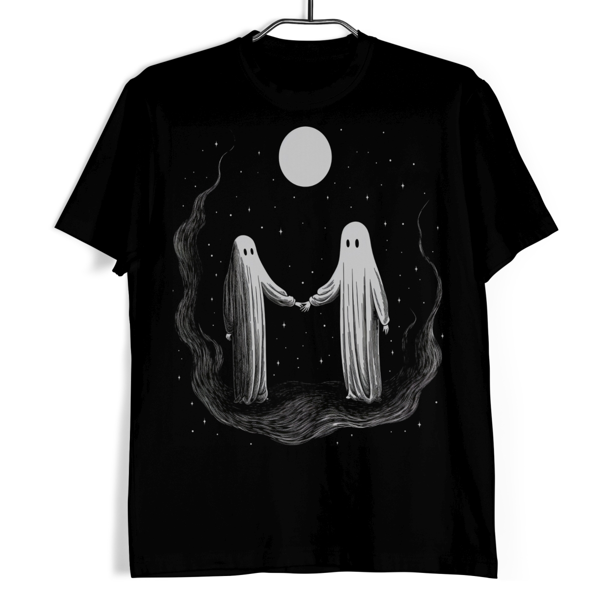 Koszulka męska w kolorze czarnym ze wzorem przedstawiającym trzymające się za ręce duszki. Idealna propozycja dla miłośników Halloween.