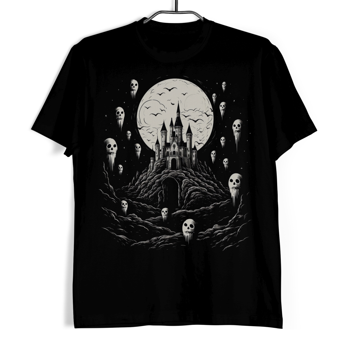Koszulka męska w kolorze czarnym ze wzorem przedstawiającym mroczny zamek na wzgórzu z duchami. Idealna propozycja dla miłośników Halloween.