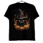 Koszulka męska w kolorze czarnym ze wzorem przedstawiającym kota wiedźmy wśród dyń . Idealna propozycja dla miłośników Halloween.