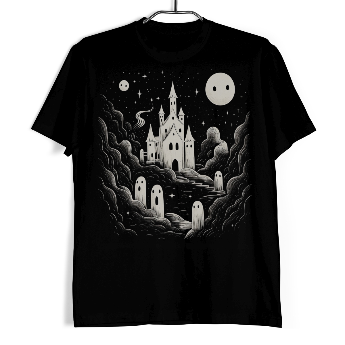 Koszulka męska w kolorze czarnym ze wzorem przedstawiającym zamek wśród mgły z duszkami. Idealna propozycja dla miłośników Halloween.