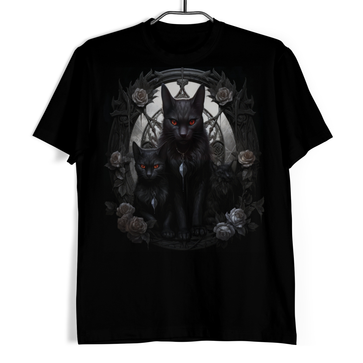 Koszulka męska w kolorze czarnym ze wzorem przedstawiającym czarne, mroczne koty wśród róż. Idealna propozycja dla osób lubujących się w gotyckich klimatach oraz miłośników kotów.