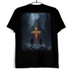 Koszulka męska w kolorze czarnym ze wzorem przedstawiającym płonący przez ludzi krzyż na tle gór.