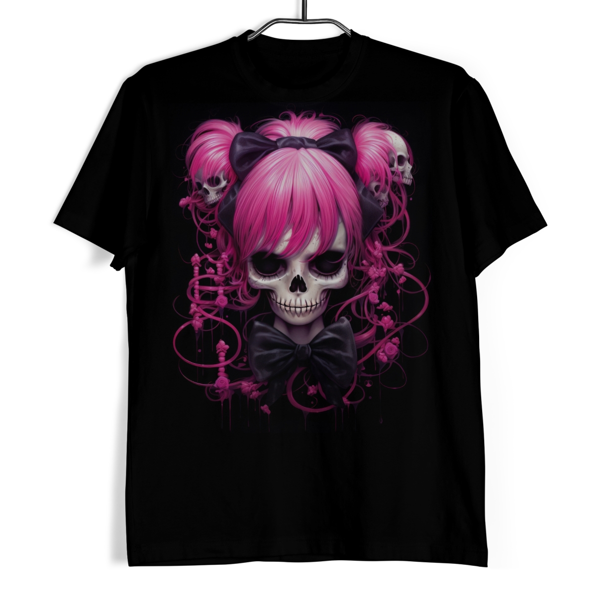 Koszulka męska w kolorze czarnym ze wzorem przedstawiającym czaszkę z różowymi włosami w stylu Emo.