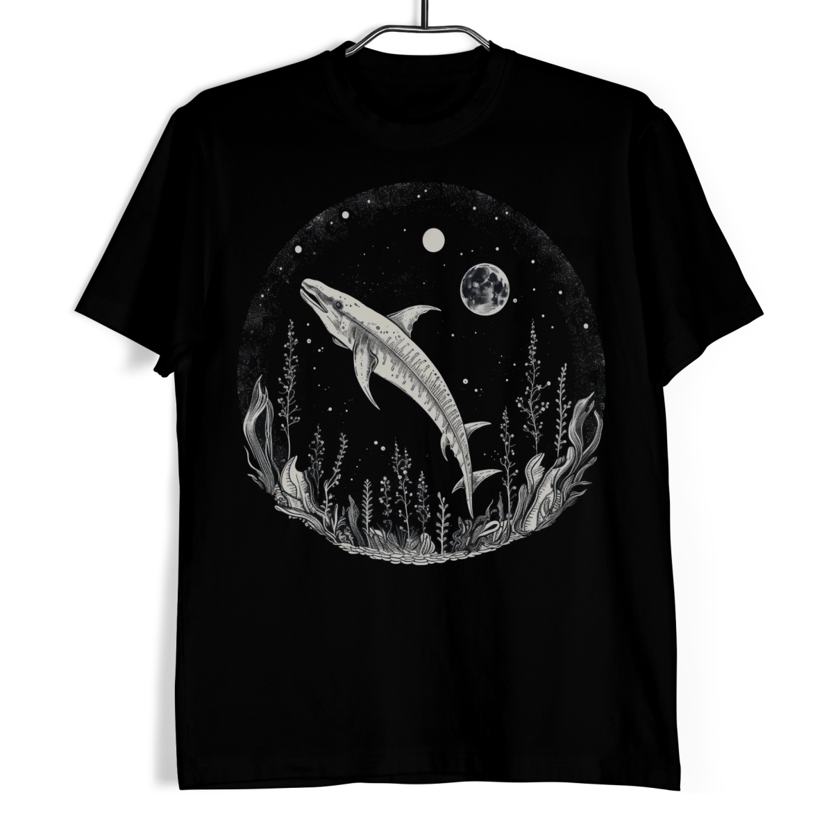 Koszulka męska w kolorze czarnym ze wzorem przedstawiającym wieloryba wśród roślin na tle gwiazd oraz księżyca.