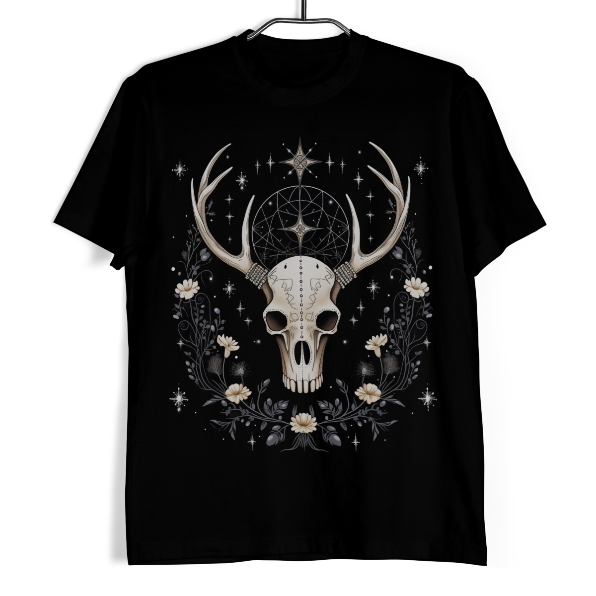 Koszulka męska w kolorze czarnym ze wzorem przedstawiającym czaszkę jelenia w kompozycki gwiazd oraz roślin.