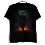 Koszulka męska w kolorze czarnym ze wzorem przedstawiającym idącą mroczną postać trzymającą róże.