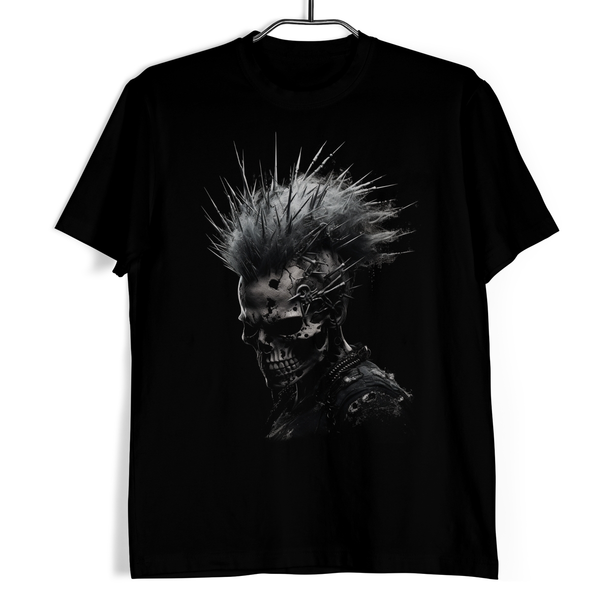 Koszulka męska w kolorze czarnym ze wzorem przedstawiającym czaszkę z białym irokezem w stylu punkowym.