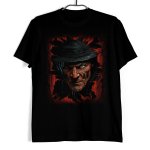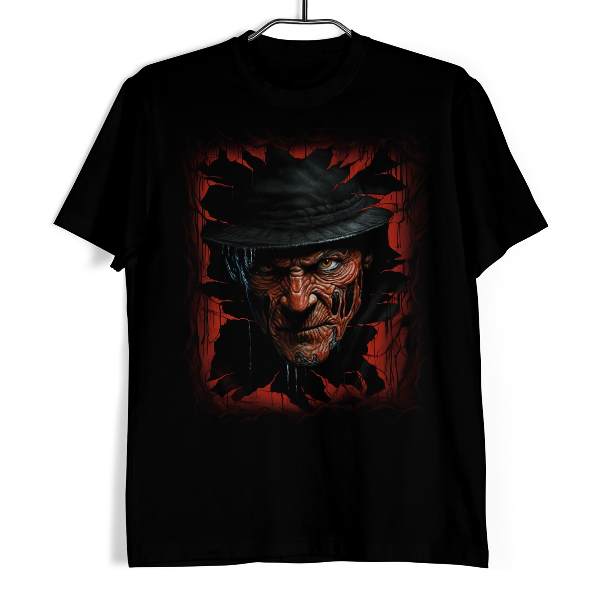Koszulka męska w kolorze czarnym ze wzorem przedstawiającym bohatera filmu "Koszmar z ulicy Wiązów". czyli Freddy Krueger. Klasyka horrorów.