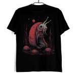 Koszulka męska w kolorze czarnym ze wzorem przedstawiającym strasznego, a zarazem słodkiego robala w dziwnym, bajkowym świecie.