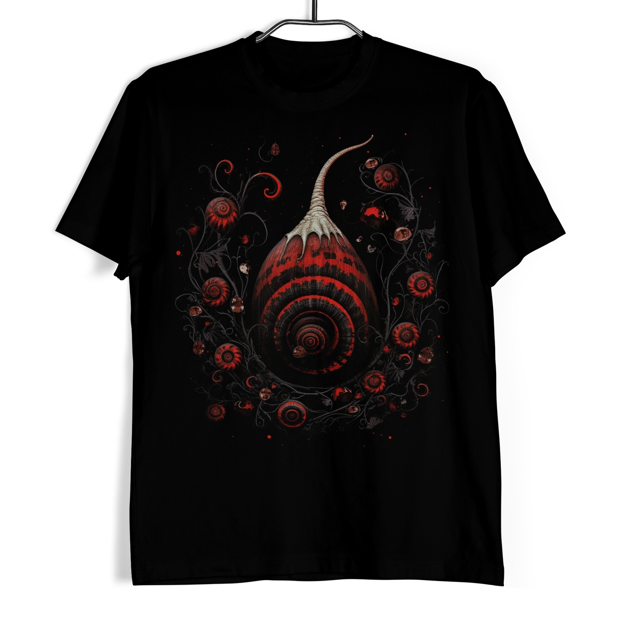 Koszulka męska w kolorze czarnym ze wzorem przedstawiającym ciekawą kompozycję kwiatów, jakby gnijących a jednocześnie żywych w ciepłych kolorach.