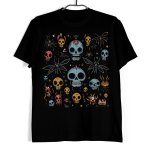 Koszulka męska w kolorze czarnym ze wzorem graficznym przedstawiającym kompozycję czaszek meksykańskich z owadami.