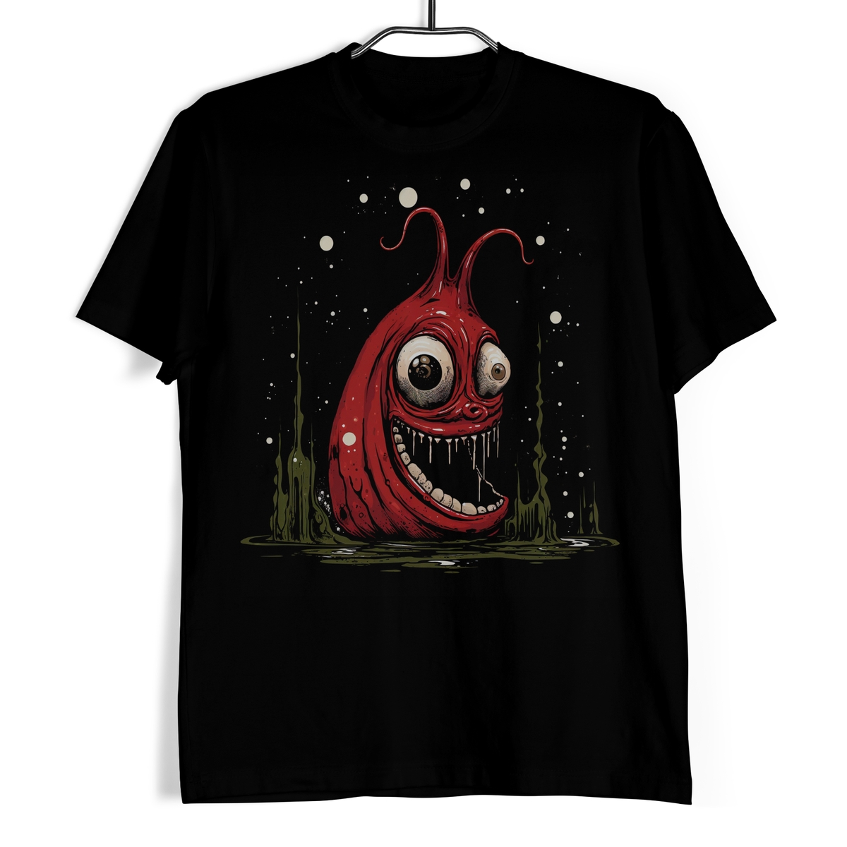 Koszulka męska w kolorze czarnym ze wzorem graficznym przedstawiającym potwornego, czerwonego robala na bagnach.