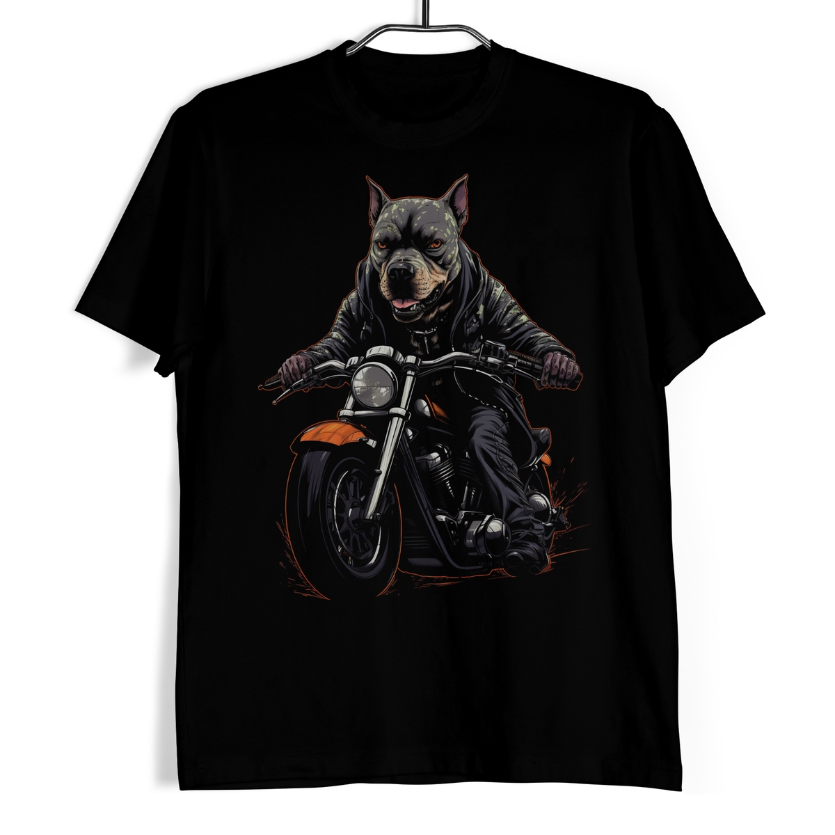 Koszulka męska w kolorze czarnym z nadrukiem rozszczekanego psiego motocyklisty.