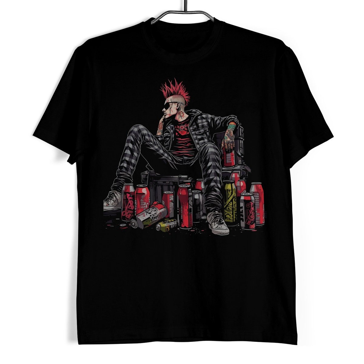 Koszulka męska w kolorze czarnym z nadrukiem wytatuowanego punka wśród puszek.