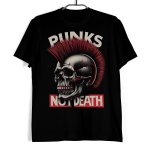Koszulka męska w kolorze czarnym z nadrukiem czaszki z czerwonym irokezem oraz napisem "PUNKS NOT DEAD".