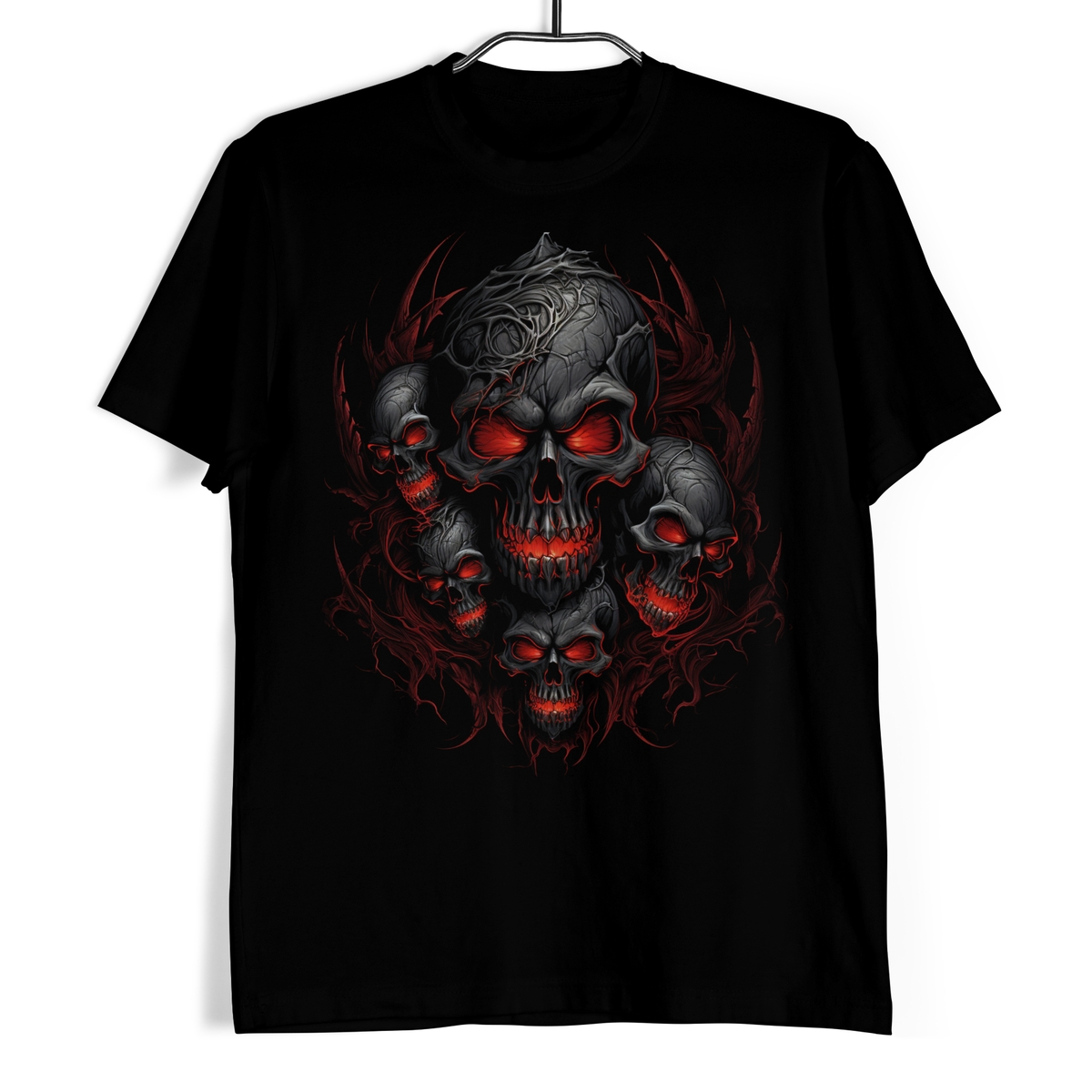 Koszulka męska w kolorze czarnym z nadrukiem grupy czaszek posiadającymi diabelskie czerwone ślepia.
