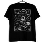 Koszulka męska w kolorze czarnym ze wzorem przedstawiającym diaboliczną meduzę wśród pentagramów z czaszką.