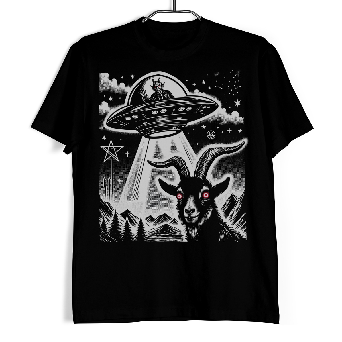 Koszulka męska w kolorze czarnym ze wzorem przedstawiającym porywaną przez kosmitę satanistyczną kozę.
