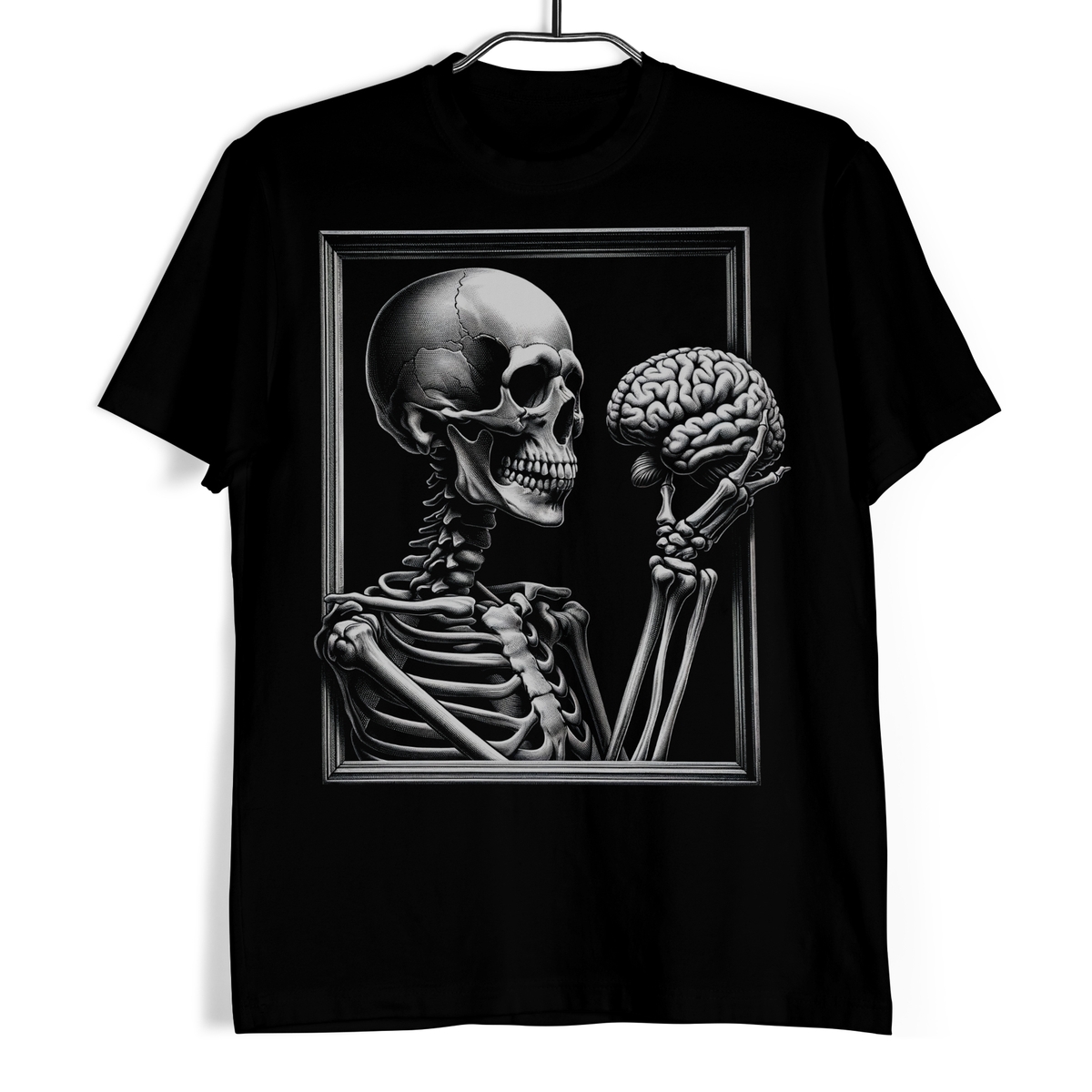 Koszulka męska w kolorze czarnym ze wzorem przedstawiającym szkieleta z mózgiem w ręku.