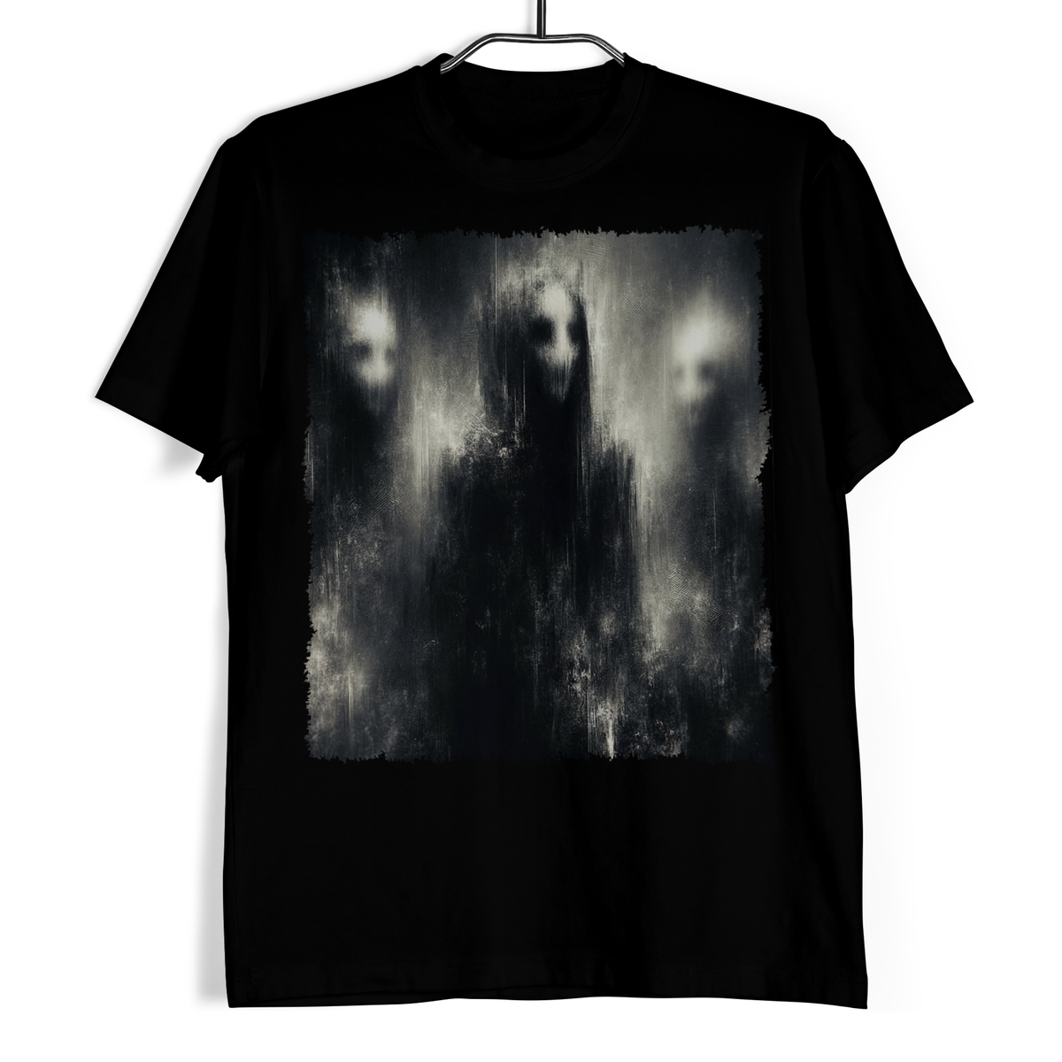 Koszulka męska w kolorze czarnym ze wzorem przedstawiającym niewyraźne koszmarne postacie.