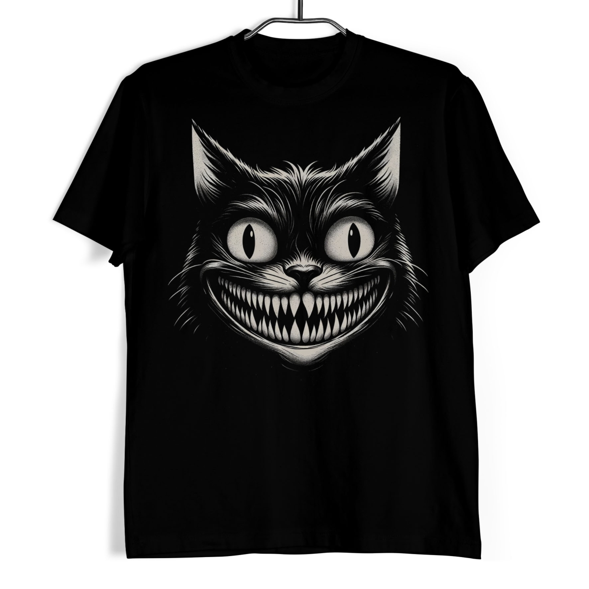 Koszulka męska w kolorze czarnym ze wzorem przedstawiającym szyderczego kota.