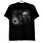 Koszulka męska w kolorze czarnym ze wzorem przedstawiającym pajęczą lalkę niczym z horrorów.