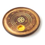 Podstawka do kadzideł w kształcie koła, wykonana z drzewa mango, ozdobiona umieszczonym pośrodku pentagramem w miedzianym kolorze.