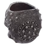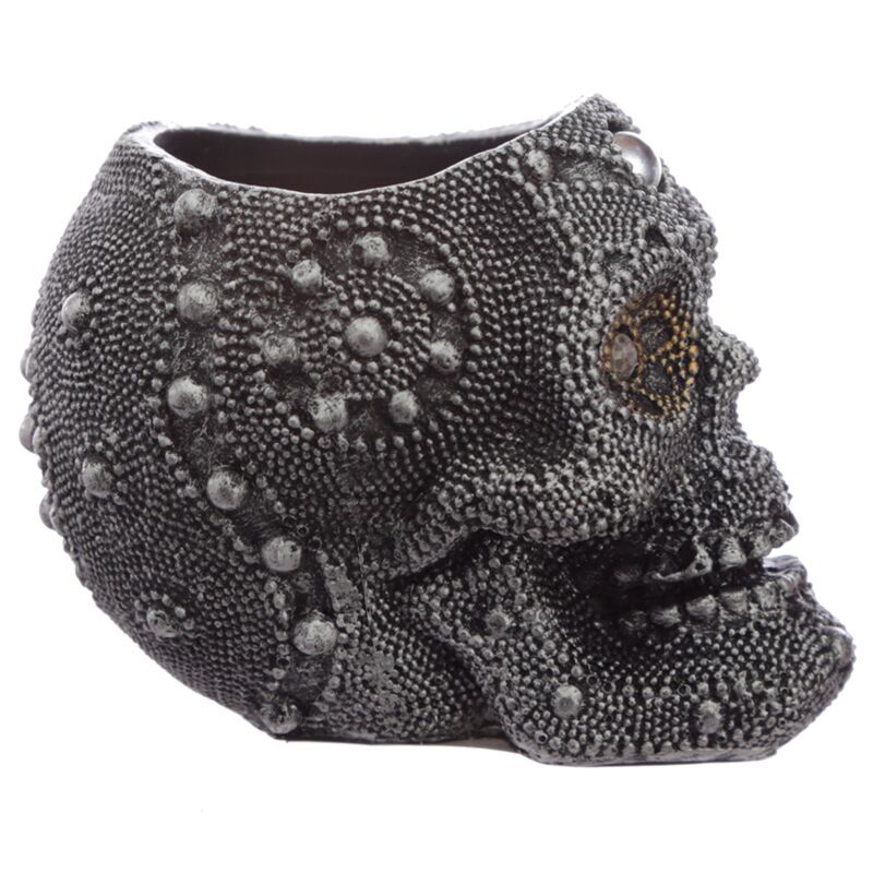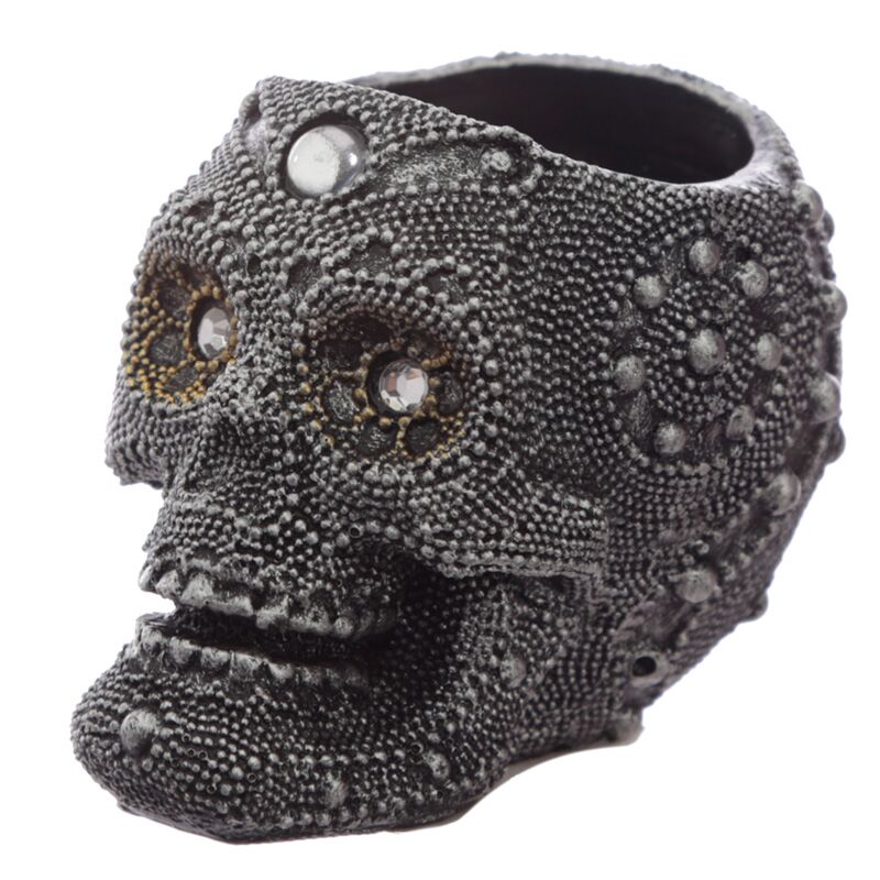 Mały świecznik w kształcie ludzkiej czaszki. W kolorze czerni oraz bardzo ciemnego srebra.