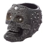 Czaszka ozdobiona jest na całej powierzchni skomplikowanymi wzorami ułożonymi z drobnych, wypukłych koralików oraz przezroczystymi kryształkami.