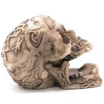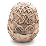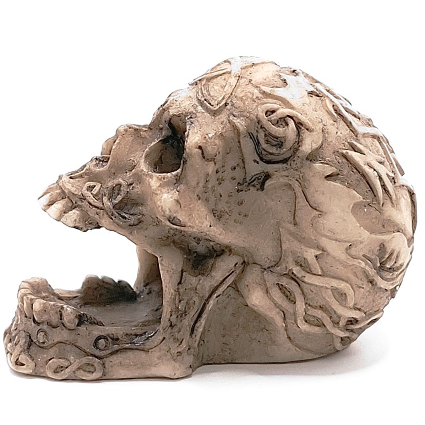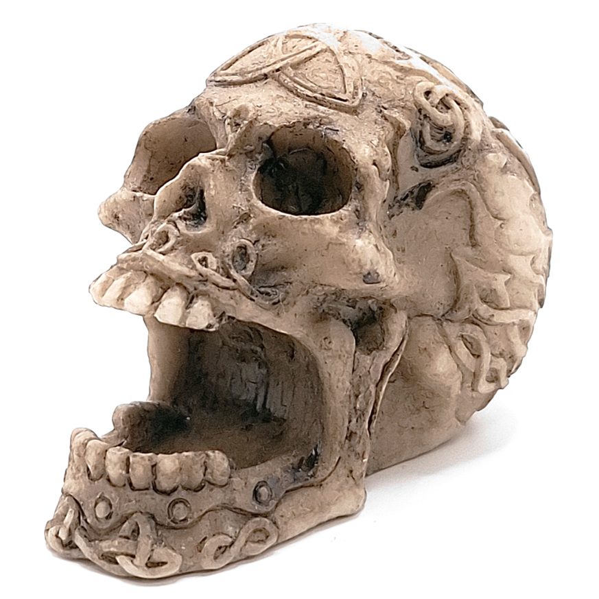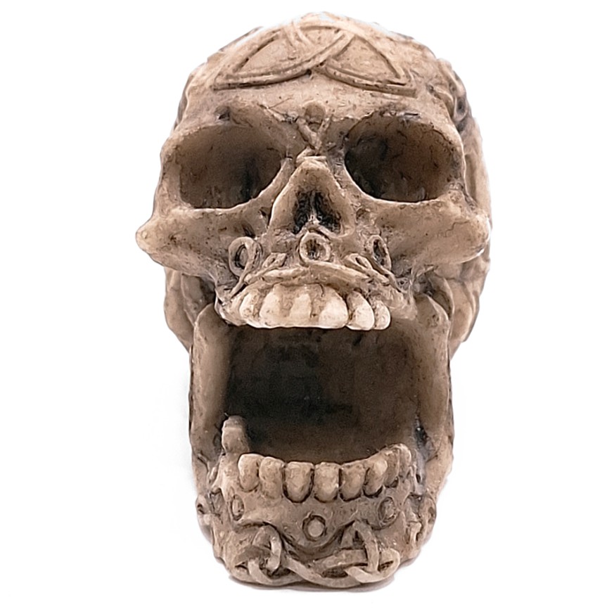 Figurka w kształcie ludzkiej czaszki celtyckimi ornamentami.Czacha jest misternie udekorowana na całej powierzchni ozdobnymi, wypukłymi wzorkami.