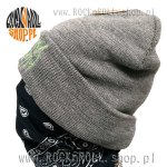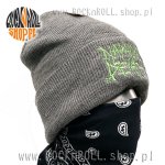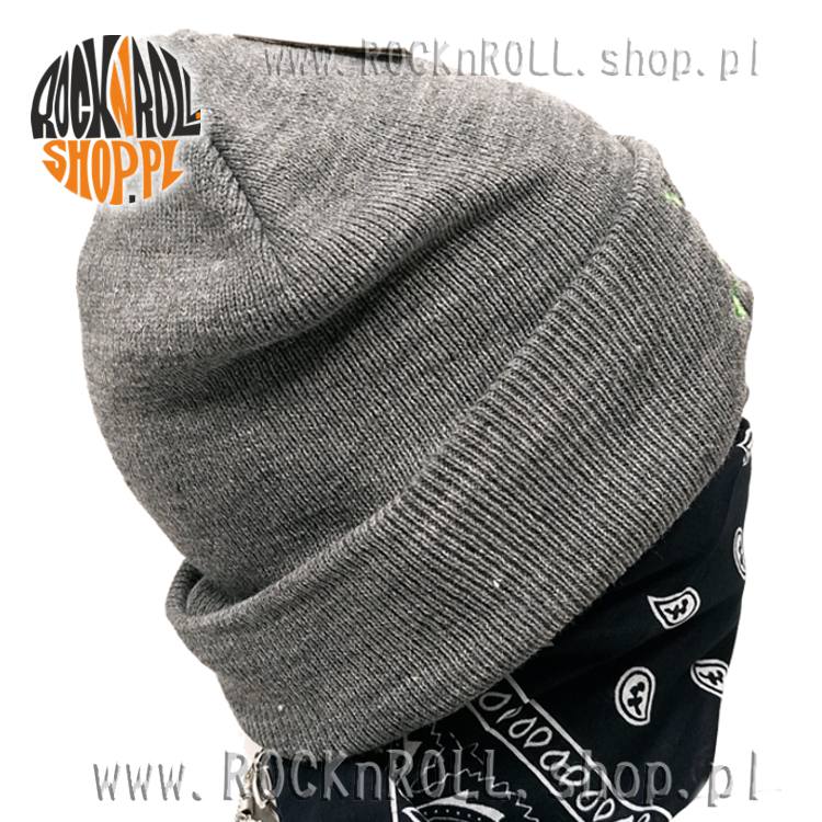 Szara, zimowa czapka wykonana z wełny akrylowej, która dobrze dopasowuje się do głowy i zapewnia ciepło.