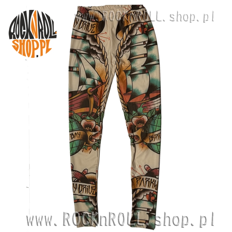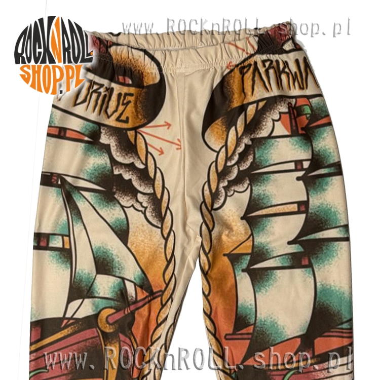 Na legginsach znajdziesz motywy takie jak żaglowce, liny okrętowe czy kwiaty, przedstawione w charakterystycznej, ograniczonej palecie barw.