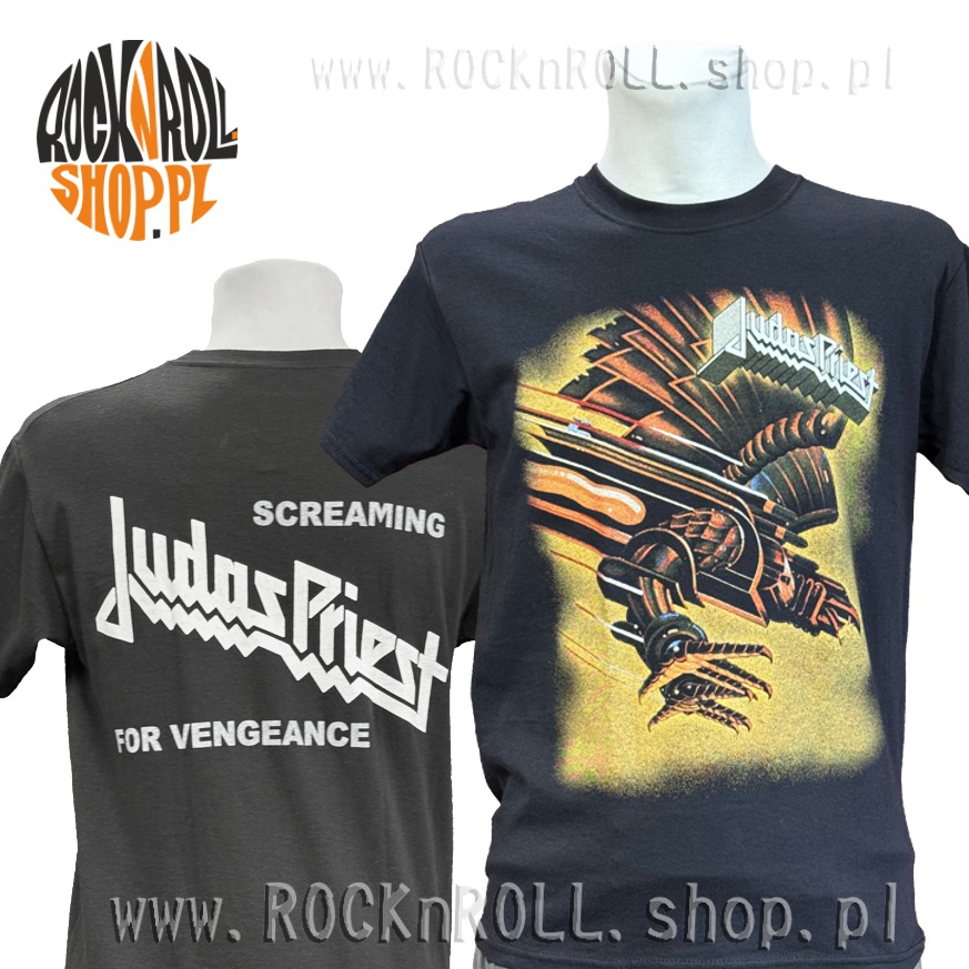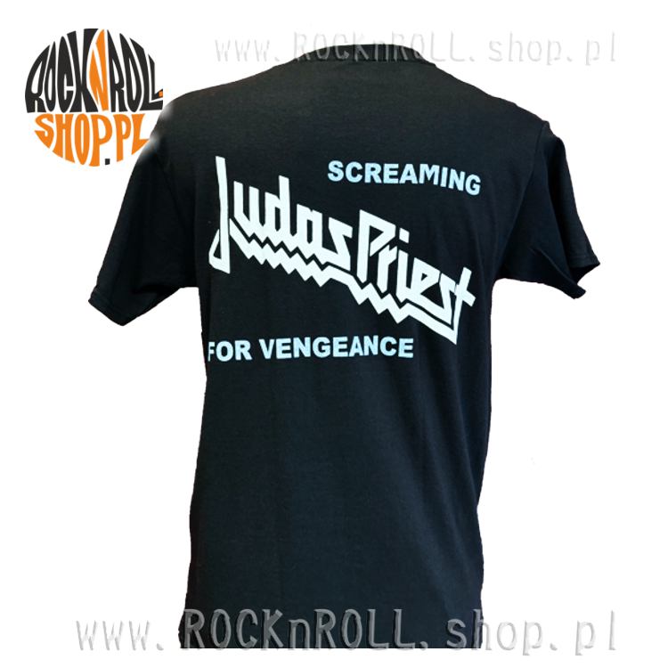 Tył koszulki zdobi duże logo Judas Priest oraz napis "Screaming for Vengeance" w charakterystycznym stylu zespołu.