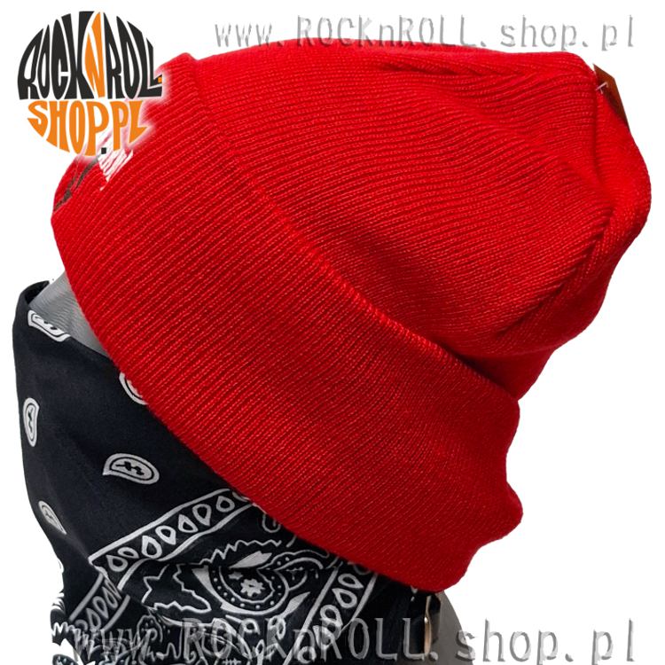 Czerwona, zimowa czapka wykonana z wełny akrylowej, która dobrze dopasowuje się do głowy i zapewnia ciepło.