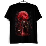 Koszulka męska w kolorze czarnym ze wzorem przedstawiającym rycerza-kościotrupa na tle krwawego księżyca.