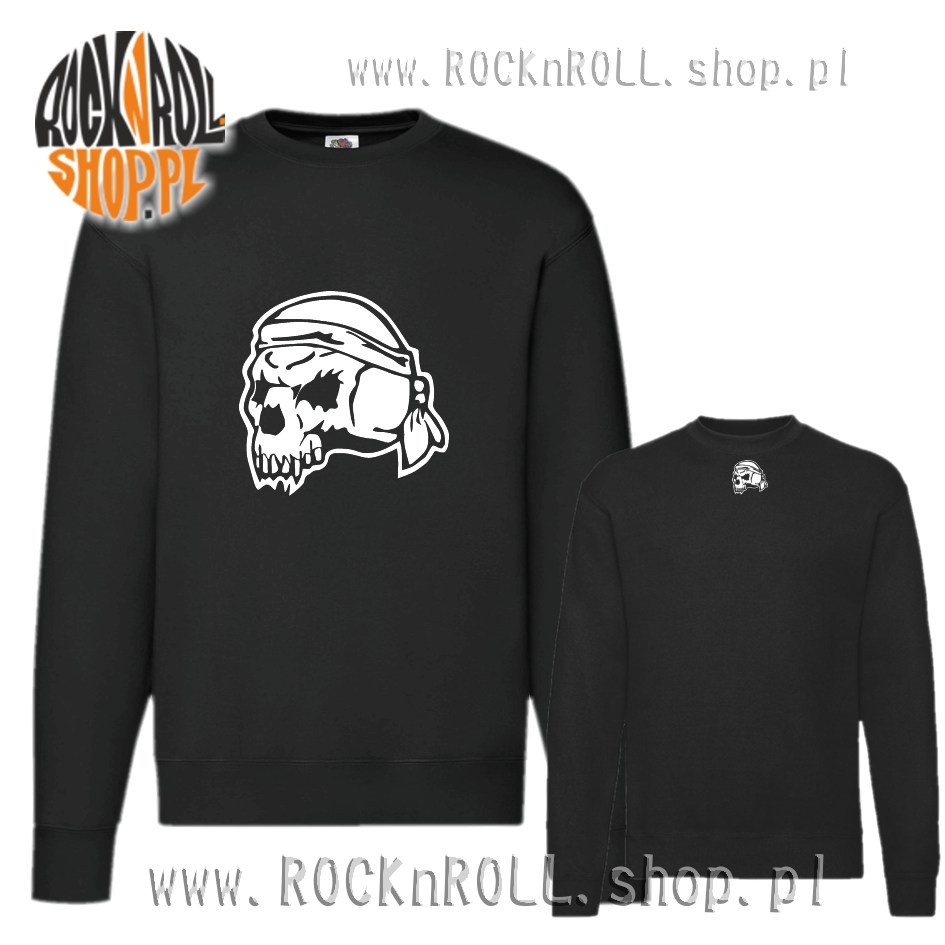 Jesienna bluza idealna dla miłośników czaszek i mroku - czacha w bandamie, taki sam nadruk mniejszy z tyłu przy karku. Bluza posiada zwężane rękawy.